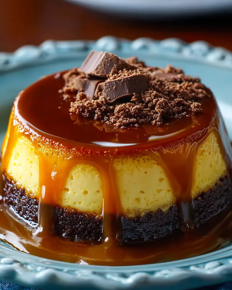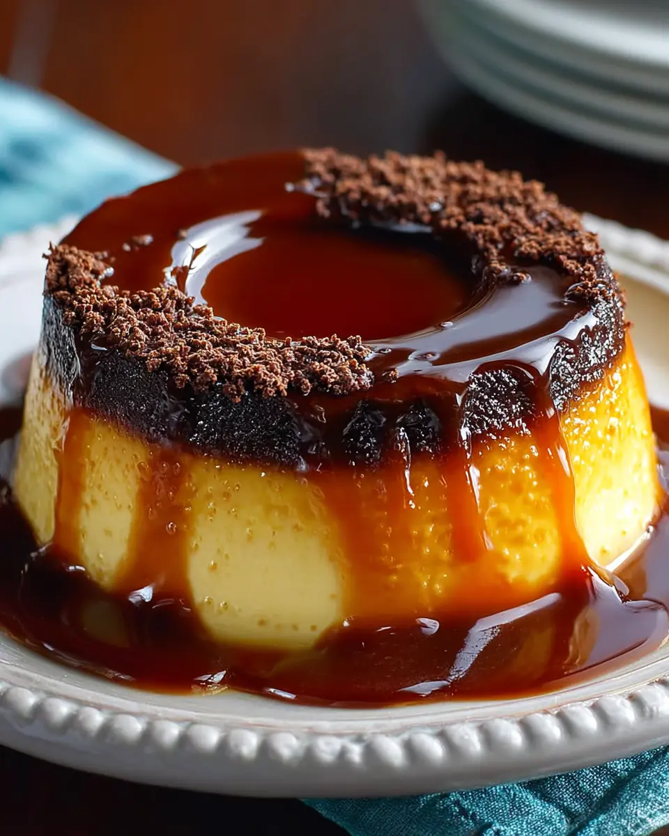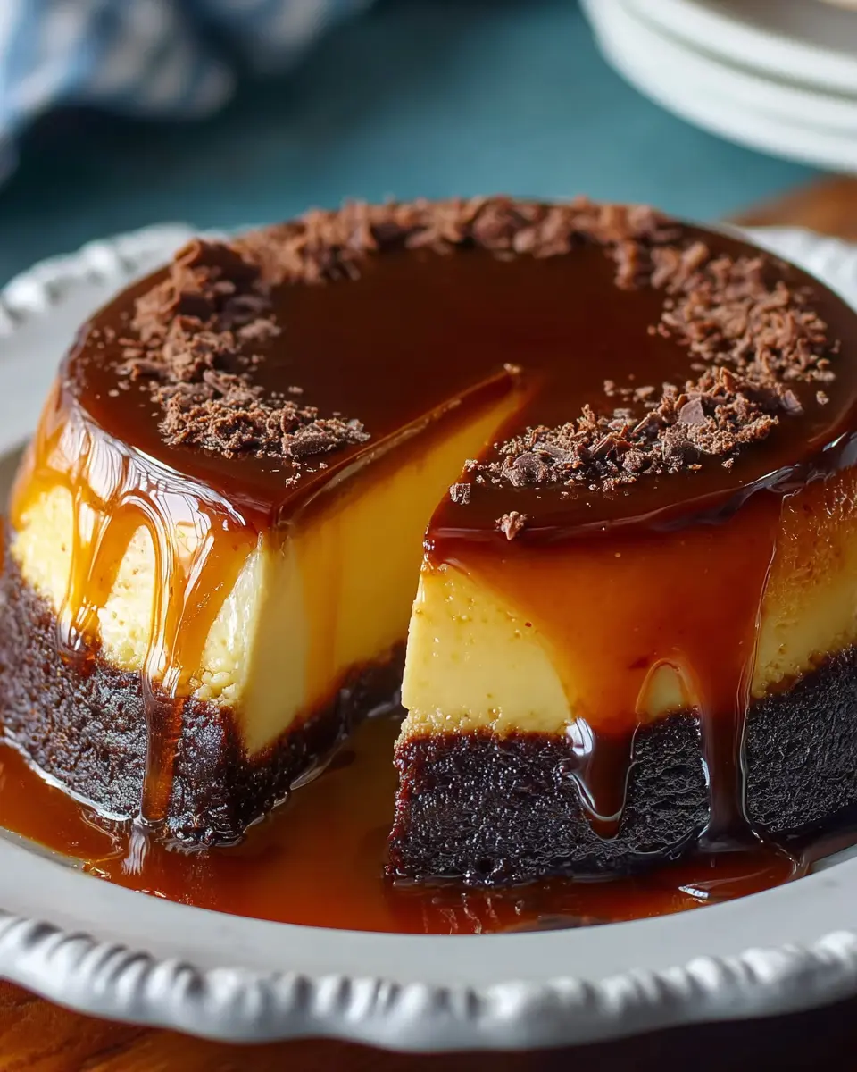 La transformation finale est à couper le souffle : lorsque vous démoulez le gâteau, le flan crémeux se trouve sur le dessus, avec une belle couche de caramel brillant en dessous. Vous avez désormais un Chocoflan Magique qui allie plaisir visuel et saveurs inoubliables.